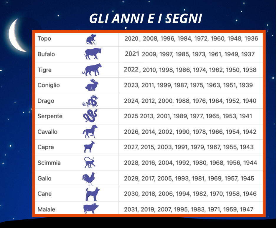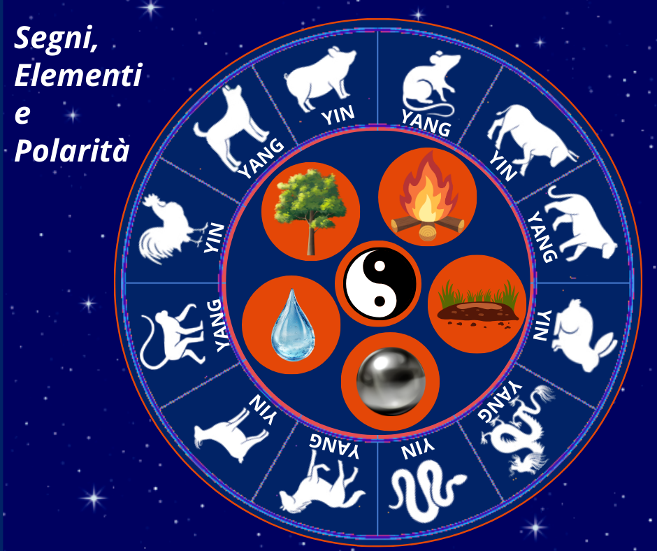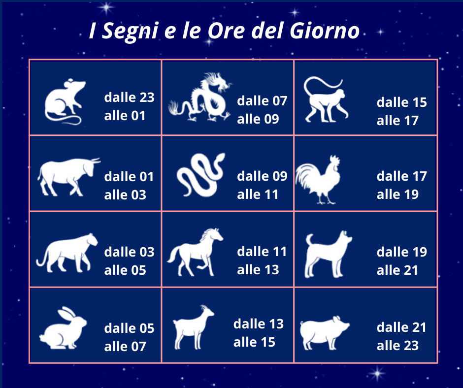 Gli animali governano anche le ore del giorno. Come per il calcolo dell’ascendente nell’oroscopo occidentale, le 24 ore del giorno sono suddivise in gruppi di due e ogni gruppo è affidato ad un animale, come indicato nella tabella dedicata. Oltre all’animale, ogni anno è legato a uno dei cinque elementi: Legno, Fuoco, Terra, Metallo e Acqua. Appartengono: • all’elemento Metallo gli anni che finiscono con lo zero e con l’uno e portano forza, determinazione e rigore; • all’elemento Acqua quelli che terminano con due o tre e regalano fluidità, adattabilità e intuizione; • all’elemento Legno quelli che terminano con quattro e cinque e sono caratterizzati da creatività, crescita e flessibilità; • all’elemento Fuoco quelli che finiscono con sei e sette e sono pieni di passione, dinamismo e impulsività; • all’elemento Terra quelli che terminano con otto e nove e danno stabilità, concretezza e pazienza. Così gli elementi si combinano con gli animali formando un ciclo completo di 60 anni (12 animali × 5 elementi). Ad esempio il 2024 è stato l’anno del Drago di Legno, il 2025 quello del Serpente di Legno e il 2026 è l’anno del Cavallo di Fuoco, il 2927 quello della Capra di Fuoco.